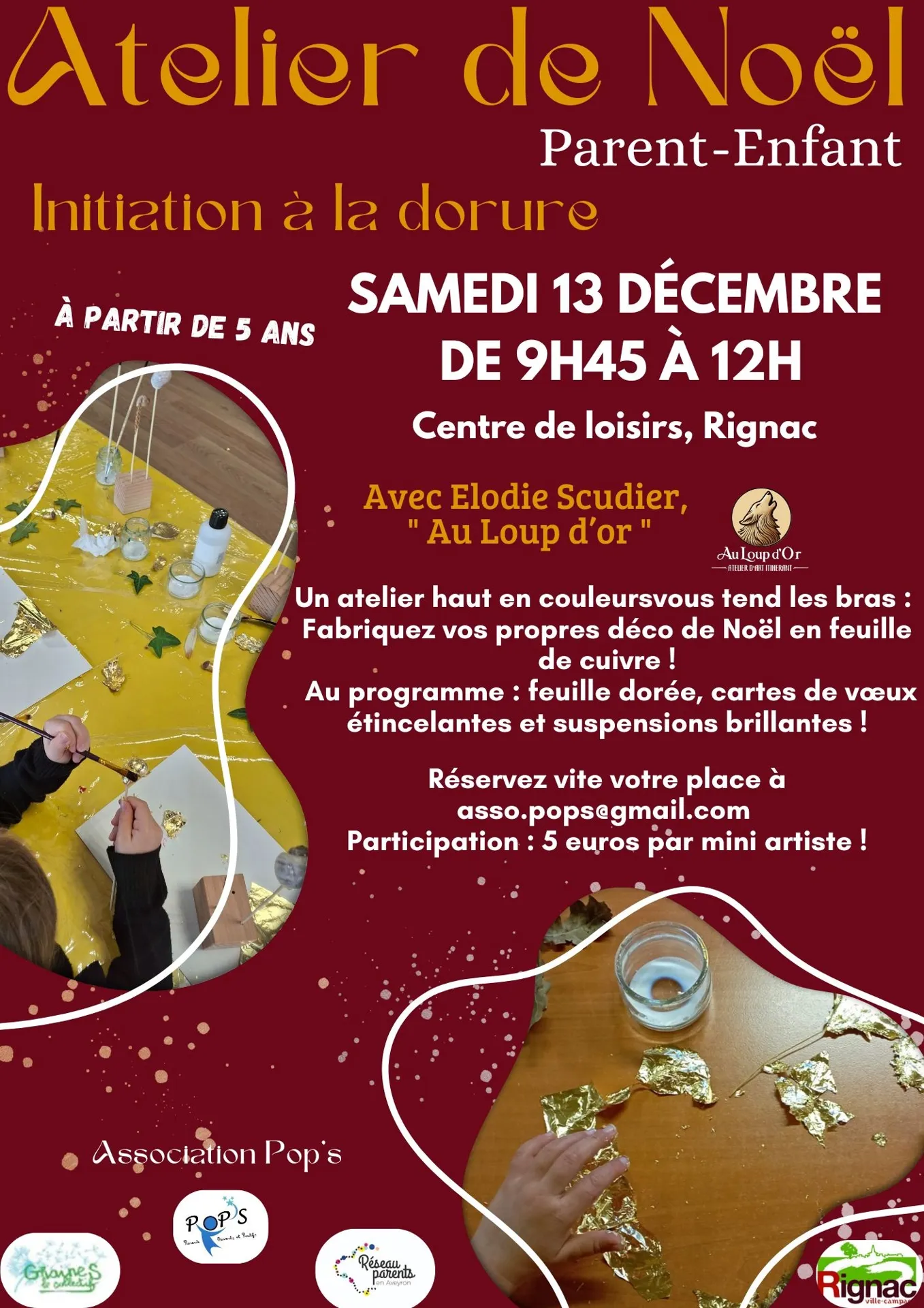 Atelier Parent–Enfant spécial Noël : Initiation à la dorure, animé par Élodie Scudier (« Au Loup d’or »).
